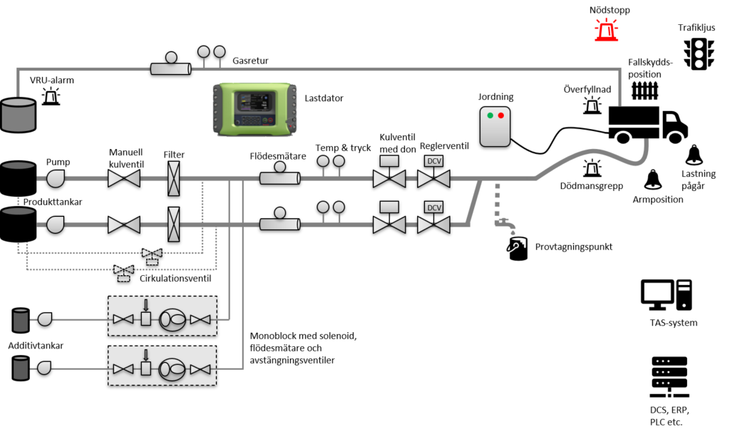 Hjärnan och hjärtat i ett utlastningssystem är en lastdator som tar hand om bland annat föraridentifikation, receptblandning, ventilstyrning, samt jordning- och överfyllnadskontroll. Via Terminal Manager från Honeywell kan vi styra hela flödet från det att den tomma lastbilen kommer in genom grinden till den är fylld och lämnar platsen. Vi hanterar identifiering av förare och fordon, kundorder, kösystem, blandningsrecept och mycket mer. Denna systemlösning gör din lastning både personsäker, administrationssäker och miljövänlig.